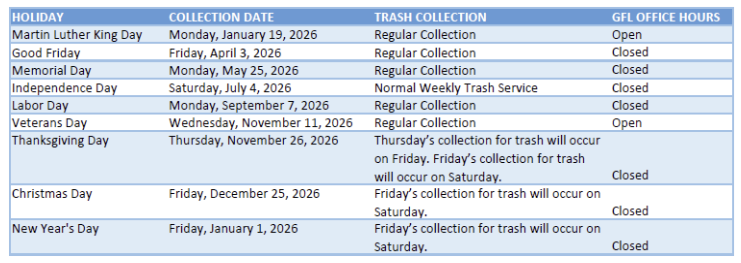 • If a service day falls on Thanksgiving, Christmas Day, or New Year’s Day, service will resume the following Saturday after the holiday.